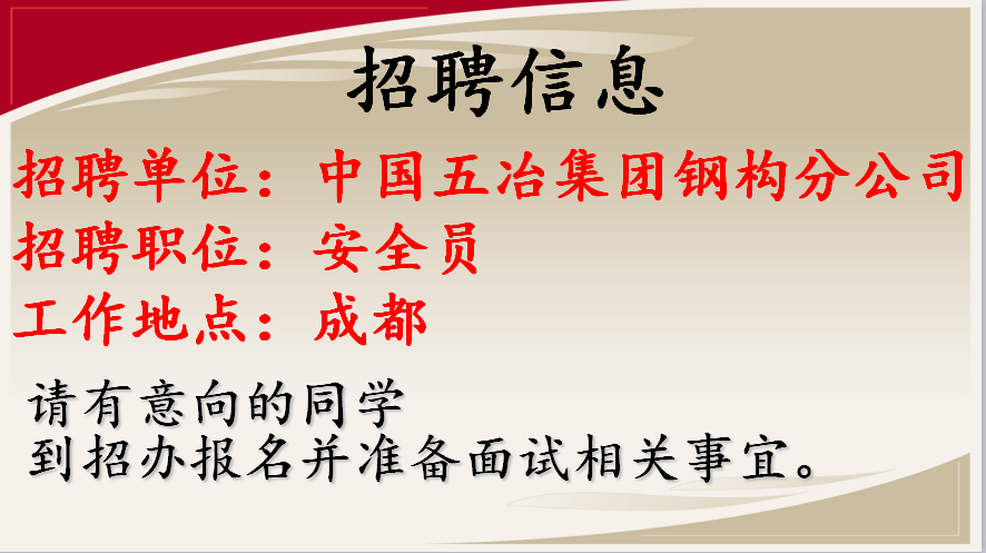 中国五冶集团有限公司钢结构分公司将于近期到我校招聘安全员若干,要求应聘者能吃苦耐劳,积极上进,有责任心,有原则性,具备一定的沟通协调能力。请有意向的同学到招办报名并准备好面试相关事宜。如有疑问,请致电 028-84711820。